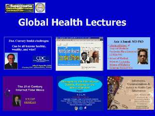 People 2000” in the US, a lecture from the head of CDC, Dr. Jeff Koplan, “Health system research” lecture from South Africa, “Malaria” lecture from Malaysia, “Online patient education” lectures from Singapore, by Dr. KC Lun, the president of the International Medical Informatics Association (IMIA). “Future of the Internet”, a lecture by Dr. Vint Cerf, the father of the Internet. Supercourse is global health lectures. Lectures are not only from the US, but also from other American countries and European countries, also from African and Asian countries. The topics cover public health and information technology. |