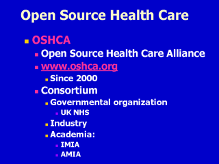development of OS health care applications. UK National Health System (NHS) is promoting this effort. There are growing interest in OS development in the American Medical Informatics Association (AMIA) and the International Medical Informatics Association (IMIA). You can find most recent presentations on OS movement in health care, which were presented at the OSHCA annual meeting held in London in September. |