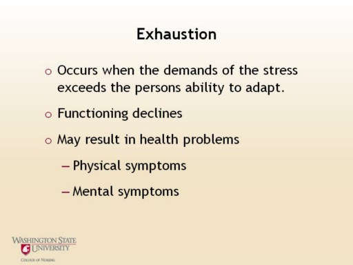 Exhaustion occurs when resources are diminished and the body can no longer compensate for the stressor (Copstead & Banasik, 2010).