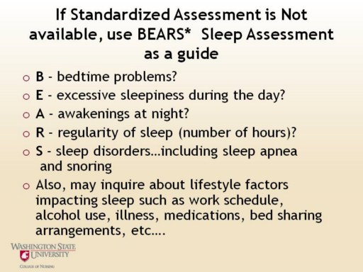 http://www.meritsleep.com/Web_Data/bears screen tool (peds) 20090721.pdf Owens, J., and Dalzell, V. 2005. Use of “BEARS” sleep screening tool in a pediatric residents’ continuity clinic: A pilot study. Sleep Medicine, 6(1), 63-69.
