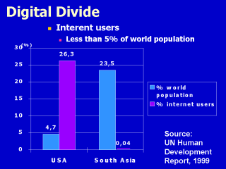 Development Report, 1999 5% of world population lives in the US. But only 0.04% of world internet users are in south Asian regions. |