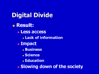 digital divide is lack of information and being behind the information competition. Digital divide has impact on business, science, and education in general. It slows down the development of the society in many aspects. So how do we cross the digital divide and foster the development? |