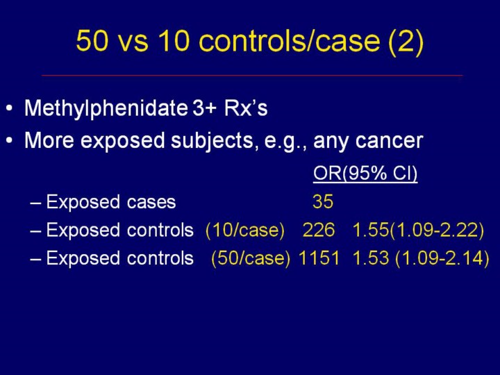 In the same study, there were considerably more exposed cases when we looked at all cancers combined. Here the odds ratios and confidence intervals for 50 vs. 10 controls per case were virtually identical. |
