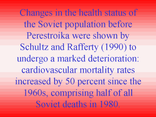 | Life expectancy for men in 1980 declined to 62.2 years from 67 years in 1964 (Feshbach, 1982b). Average number of annual deaths per 1000 males increased steadily from 8.9 in 1970-1971 to 9.7 in 1974-1975 to 11.1 in 1980-1981. The rate of increase was slightly less for women (Feshbach, 1985b; Moscow Executive Committee, 1991). |