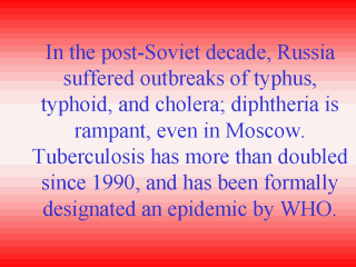 | The impact of infectious diseases has been primarily due to laxity in vaccinations and migration through porous borders from Asian regions. In 1995, deaths from infectious and parasitic diseases were less than 2 percent of the overall age-standardized death rate, while most of the decrease in life expectancy, between 1987-1994, has been due to mortality from cardiovascular diseases and external causes of violence, trauma, and accidents (see next slide). |