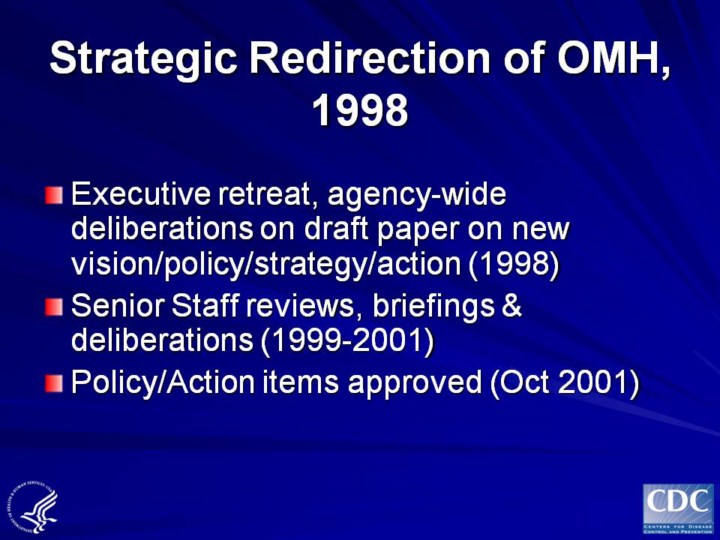 A strategic planning process was initiated starting with an Executive retreat and agency-wide deliberations on draft paper describing a new, unified minority health vision/policy/strategy/action agenda (1998).