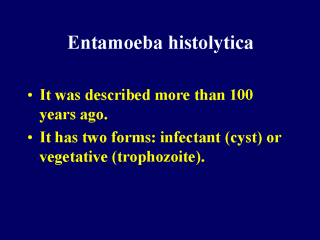 | Entamoeba histolytica was described by Frederich Losch more than 100 years ago in Saint Petersburg. It is tramssmited by the cycle anal- hand- mounth and the man is the main reserve. As asymptomatic carrier or in convalescence, he is the principal source of cysts that contaminate the envirnoment and infect other people. |