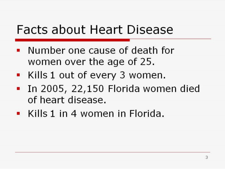 Heart disease claims more women's lives than the next five leading causes of death combined, including cancer, chronic obstructive pulmonary disease, Alzheimer's disease, diabetes and accidents It’s the Number one cause of death for women over the age of 25. It is the cause of death for 1 out of every 3 women in the US and 1 of every 4 in Florida. In 2005, 22,150 Florida women died of heart disease.