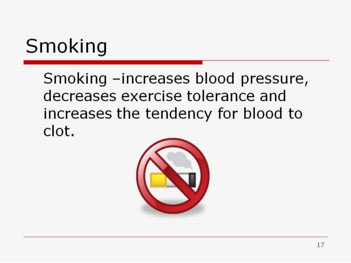 Smoking is the single most preventable cause of death in the United States. Smoking is a major cause of cardiovascular heart disease among women. As mentioned earlier, nicotine can cause the injury to blood vessels that allows plaque to collect and causes increased blood pressure. Women who smoke have an increased risk for ischemic stroke and subarachnoid hemorrhage. Constant exposure to others' tobacco smoke (secondhand smoke) at work or at home also increases the risk, even for nonsmokers. Women smokers who use hormonal contraceptives have a higher risk of heart attack and stroke than nonsmokers who use them. |