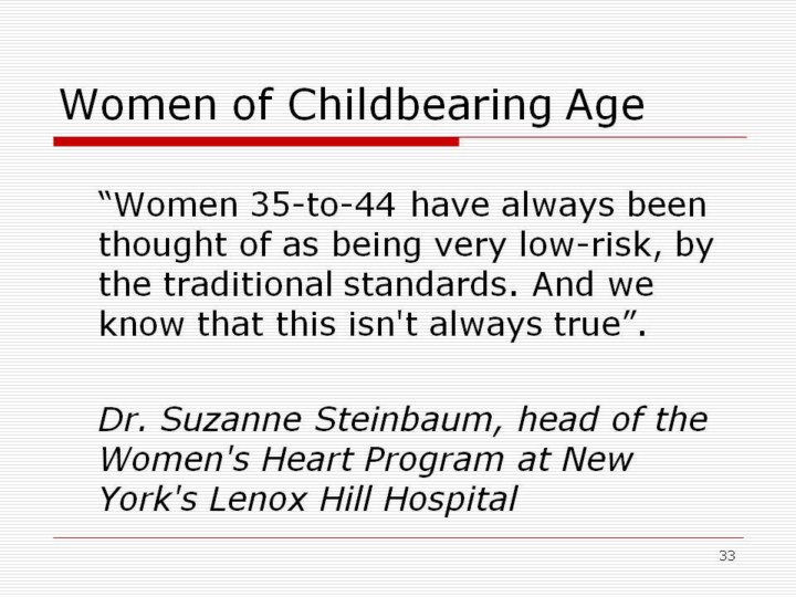 Dr. Suzanne Steinbaum, head of the Women's Heart Program at New York's Lenox Hill Hospital stated that “Women 35-to-44 have always been thought of as being very low-risk, by the traditional standards. And we know that this isn't always true”. The Journal of the American College of Cardiology reported that the death rate from coronary artery disease is increasing in young Americans, especially in women under the age of 45. The reason for this increase is not entirely clear, but the one theory is related to the increase in obesity - and as a result the increase in diabetes - among young American women. Another theory is that the increased age that women are becoming pregnant increases the risk of heart disease.