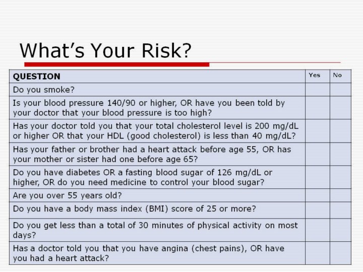 If you answered “yes” to any of these questions, you’re at an increased risk of having a heart attack. This quiz is available online at http://www.cdc.gov/women/heart/