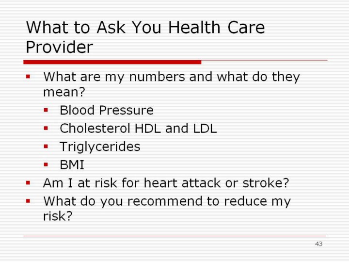 Knowing what to ask your provider allows you to partner with him or her to develop your personal heart disease prevention plan. ASK What is my risk for heart disease? What is my blood pressure? What does it mean for me, and what do I need to do about it? What are my cholesterol numbers (including total cholesterol, LDL or “bad” cholesterol, HDL or “good” cholesterol, and triglycerides)? What do they mean for me, and what do I need to do about them? What is my “body mass index”? Do I need to lose weight for my health? What is my blood sugar level? Am I at risk for diabetes? What other screening tests for heart disease do I need? How often should I return for checkups for my heart health? What can you do to help me quit smoking? How much physical activity do I need to protect my heart from disease? What is a heart-healthy eating plan for me? Should I see a registered dietitian or qualified nutritionist to learn more about healthy eating?