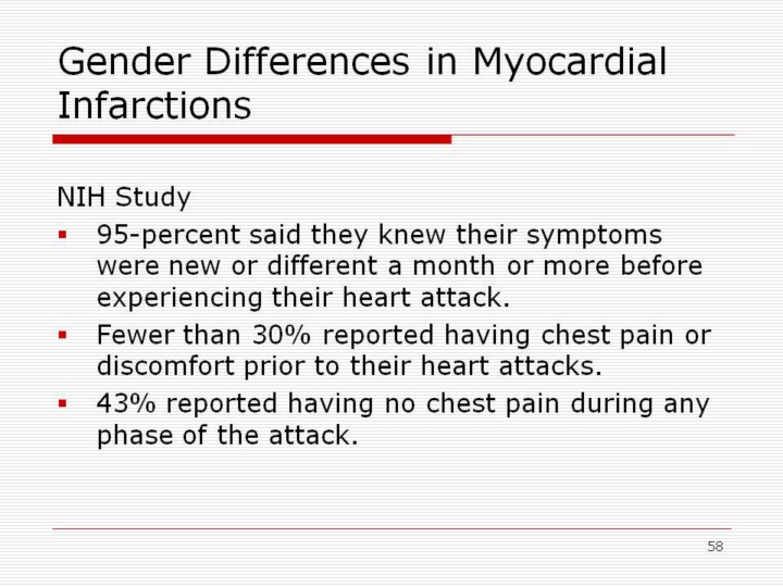 The symptoms were more gradual in onset. Most experienced NO chest pain leading up to and even during the heart attack. The symptoms most commonly reported were unusual fatigue, sleep disturbance, and shortness of breath.