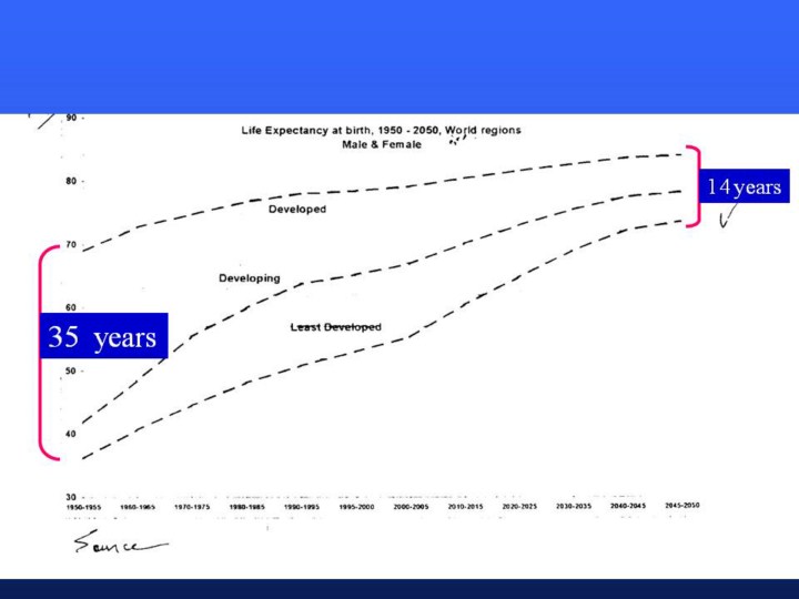In the 1950s there was a 35 year difference between developed and developing countries, now this has shrunk to only 14 years. |