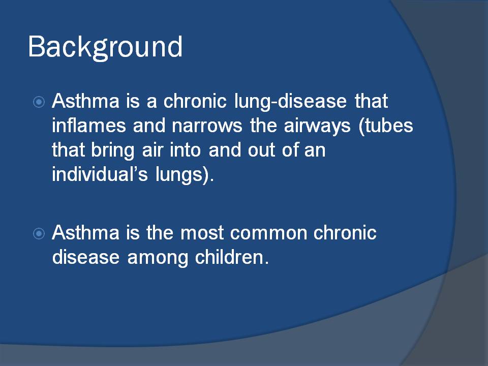 Asthma is a chronic disease affecting the lungs. It inflames and narrows the airways making breathing hard for those with asthma.