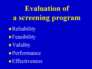 | After a risk factor or a disease is determined to be appropriate for screening, it remains unclear whether the screening program should be implemented. Health practitioners should proceed to evaluate the screening program in terms of reliability, feasibility, validity, performance and effectiveness. |