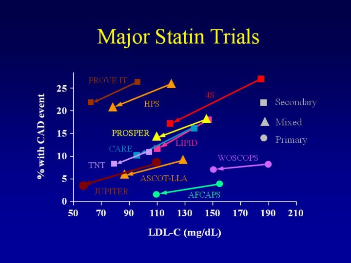 In primary prevention trials, reduction of LDL-C levels with statins was associated with a reduction in the risk of CAD events, both in patients with elevated (WOSCOPS) and average (AFCAPS/TexCAPS) LDL-C serum concentrations. Similarly, in secondary prevention trials, reduction of LDL-C levels with statins was associated with a reduction in the risk of CAD events, both in patients with elevated (4S) and average (CARE, LIPID) LDL-C serum concentrations. |