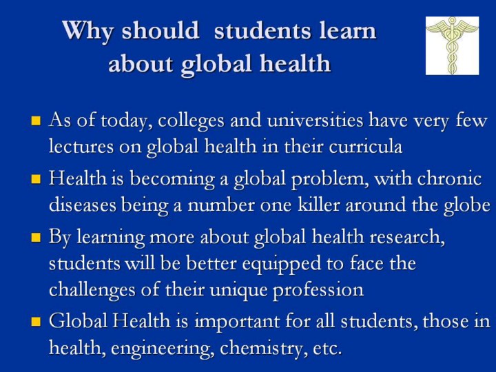 This lecture has been designed for faculty members and students at medical schools and schools of public health around the world. However, we also feel that students and faculty in all disciplines should learn about global health, as it affects us all. |