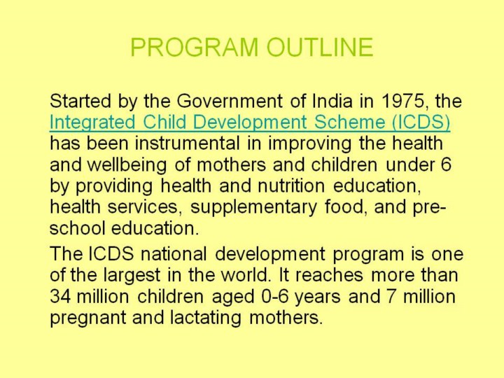 ICDS Scheme represents one of the world’s largest and most unique programmes for early childhood development. ICDS is the foremost symbol of India’s commitment to her children – India’s response to the challenge of providing pre-school education on one hand and breaking the vicious cycle of malnutrition, morbidity, reduced learning capacity and mortality, on the other. |