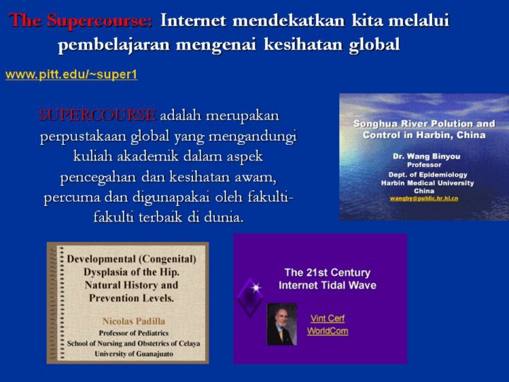 Supercourse www.pitt.edu/~super1 kini mempunyai lebih dari 4,650 kuliah yang dikongsi bersama oleh lebih dari 46,000 ahli fakulti di 172 negara. Supercourse adalah suatu model pengajaran tambahan, di mana pensyarah seluruh dunia berkongsi kuliah terbaik mereka. Penambahan jumlah kuliah Supercourse adalah khusus kepada tema berkaitan penyelidikan kesihatan global
