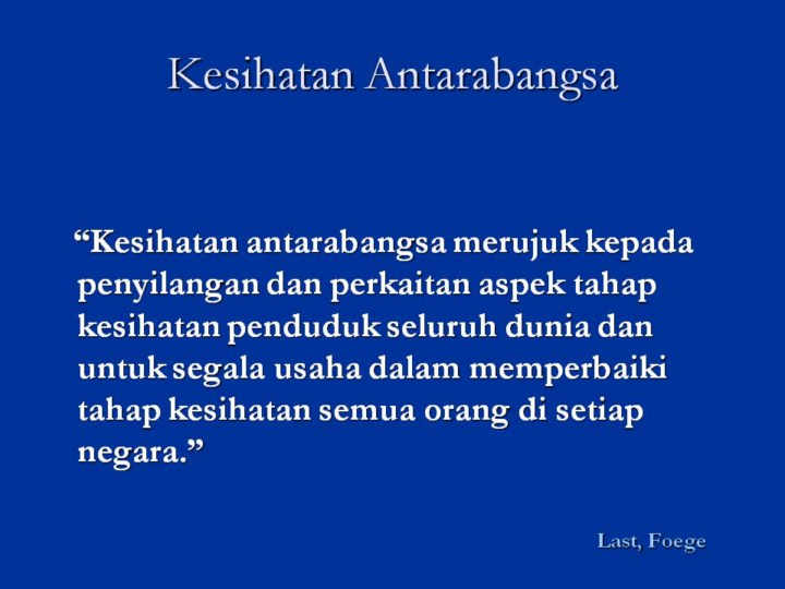 Kesihatan antarabangsa tidak wajar dilihat hanya sebagai khusus untuk suatu penyakit atau satu-satu negara itu sahaja. Kita harus memeriksa semua keadaan yang melintasi sempadan dan disiplin dan berpotensi untuk mempengaruhi kesihatan. Perkataan “antarabangsa" mengikut kamus adalah sempadan-sempadan negara, dan perkataan "global" meliputi seluruh dunia.