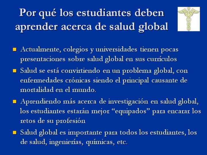 Esta presentación ha sido diseñada por miembros académicos y estudiantes de escuelas médicas  y de salud pública en el mundo. Sin embargo, sentimos que los estudiantes y profesores en todas las disciplinas deberán aprender de salud global, ya que nos afecta a todos.