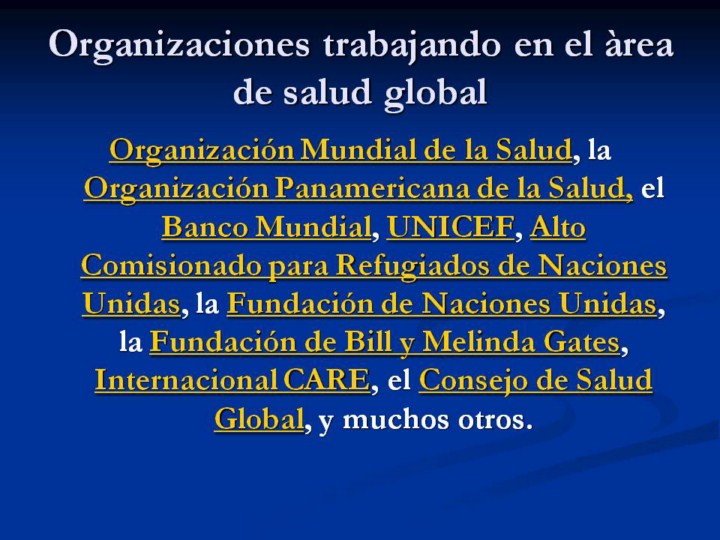 Como se aludió en previas secciones, hay muchas importantes, organizaciones multilaterales, fundaciones, organizaciones no gubernamentales enfocándose en los problemas de salud globalmente.