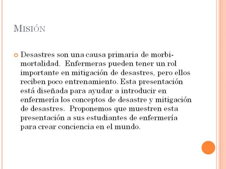En las décadas anteriores, desastres han surgido. Millones de personas han sido afectadas, pérdidas de casas y de miembros de las familias, o desplazados. Nadie tiene inmunidad ante los desastres. Sin embargo, lo que hace la diferencia es el grado de preparación. Enfermeras son el mayor grupo profesional de atención a la salud, aunque no están preparadas para desastres. Desastres tienen amenazas al bienestar psicosocial y físico. Las enfermeras ven a la salud como un estado de bienestar físico y psicosocial. En este contexto, las enfermeras quienes reciben entrenamiento en desastres pueden contribuir significativamente en la mitigación de los desastres en la zona y en todo el país. Esta presentación, pretende proveer la información básica sobre desastres y describe el rol de la enfermera en manejo de desastres en los tres niveles de prevención. Hay millones de enfermeras y miles de escuelas de enfermería que no enseñan nada sobre desastres, -especialmente en sitios expuestos a desastres naturales continuos. Los profesores en esos países necesitan material de enseñanza o de manejo de desastres. Un Supercurso de enfermería fortalecerá a los profesores de las escuelas de enfermería en el mundo, ofreciéndolas como presentaciones listas para enseñar, sobre manejo de desastres.