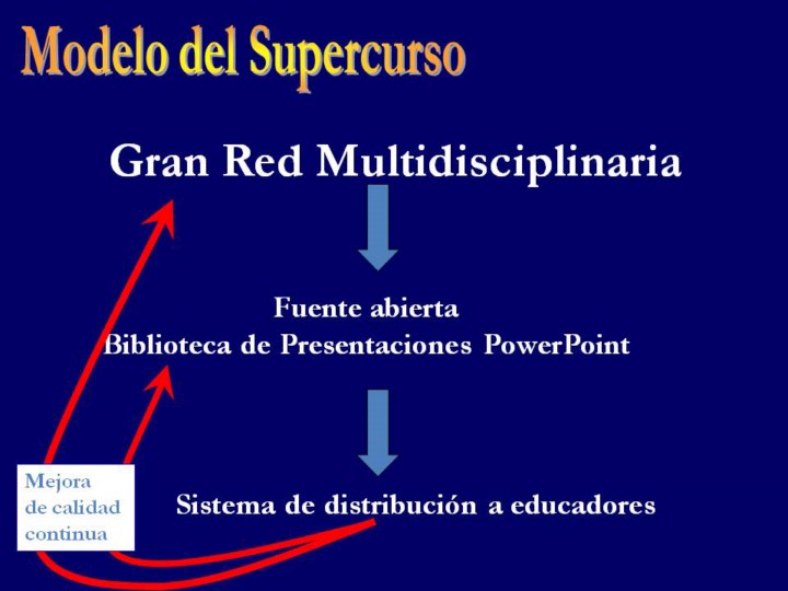 El modelo del Supercurso es simple. Primero construimos una ampli, red global internacional sobre la Web. De la red extraemos las mejores presentaciones PowerPoint y las colocamos en la web. Luego construimos una red de distribución para compartir las presentaciones. Creamos un modelo con sistema de control de calidad. |