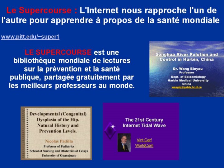 Le « Supercourse » www.pitt.edu/~super1 a actuellement plus de 4,650 conférences partagées par plus de 46 000 membres du corps professoral dans 172 pays. Le « Supercourse » est un modèle de supplément d’enseignement, où les enseignants du monde partagent leurs meilleures conférences. Un nombre croissant de présentations du « Supercourse » est dédié au thème de recherche en santé mondiale.