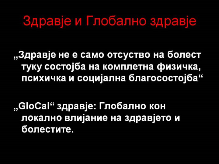 За подобрување на здравјето во светот ние треба да мислиме „GloCal “ т.е. од глобално кон локално. Пациентите седнати спроти нас се засегнати не само од влијанието на нивната локална средина туки и од состојбите во нивната заедница, земјата и целиот свет. Со нашите пациенти ние треба да мислиме локално но не заборавајќи го глобалниот аспект на состојбите. GLObal – loCAL (GloCal) |