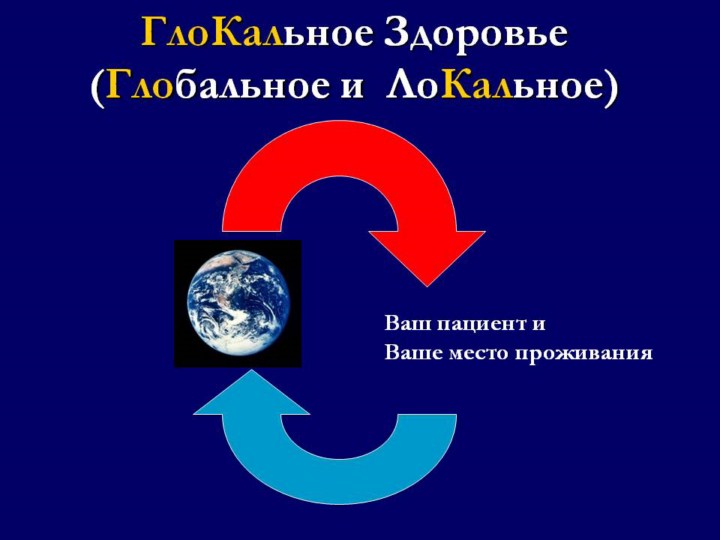 Здоровье, и локально и глобально, поэтому все врачи, медсестры и другие работники здравоохранения должны учитывать и локальные аспекты и глобальные аспекты здоровья |
