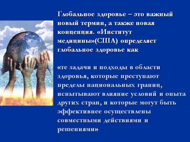 Не только проблемы здоровья переступают границы стран или являются общими для народов разных стран мира, но также и возможные пути решения этих проблем могут пересекать границы и использоваться всеми странами, независимо от уровня их развития. Все страны могут применять опыт и достижения друг друга, обмениваясь информацией. Новая трактовка глобального здоровья отображает двустороннее движение: обмен проблемами и обмен решениями. Новое определение очень важно для науки глобального здоровья, в основе которого возможность народов разных стран делиться информацией друг с другом.