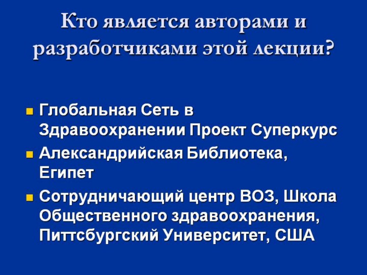 Глобальная Сеть в Здравоохранении Проект Суперкурс сотрудничает с Александрийской Библиотекой в Египте по созданию одной из крупнейших коллекций лекций по Всемирной охране здоровья. В Питтсбурге, основная работа была выполнена в рамках Сотрудничающий центр ВОЗ по мониторингу заболеваний и телекоммуникациям под руководством профессора ЛаПорт. |