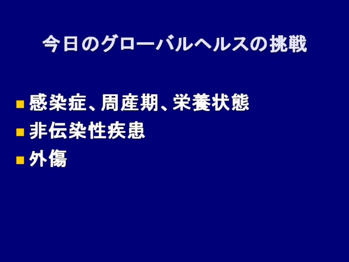 今日の語ルーばるヘルスでの大きな課題は? 1996年に公刊された “The Global Burden of Disease”では、1990年から2020年までにいかに改善させるかの大きな3つの目標グループが示されました。Group 1は、感染症、周産期、栄養状態で Group 2は非感染性疾患、Group 3は外傷です。