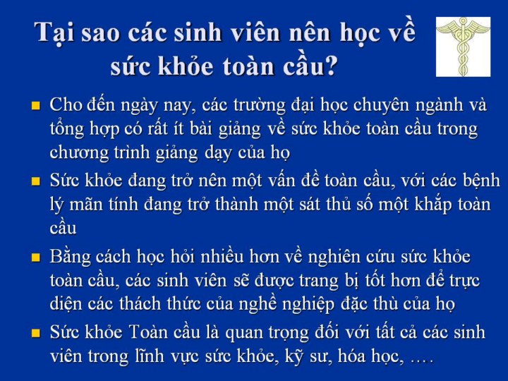 Bài giảng này được thiết kế cho các thành viên giảng viên và các sinh viên tại các trường y và trường y tế công cộng quanh thế giới. Tuy nhiên, chúng tôi cũng cảm thấy rằng các sinh viên và các giảng viên ở tất cả các chuyên ngành nên học về sức khỏe toàn cầu, bởi vì nó ảnh hưởng tất cả chúng ta.