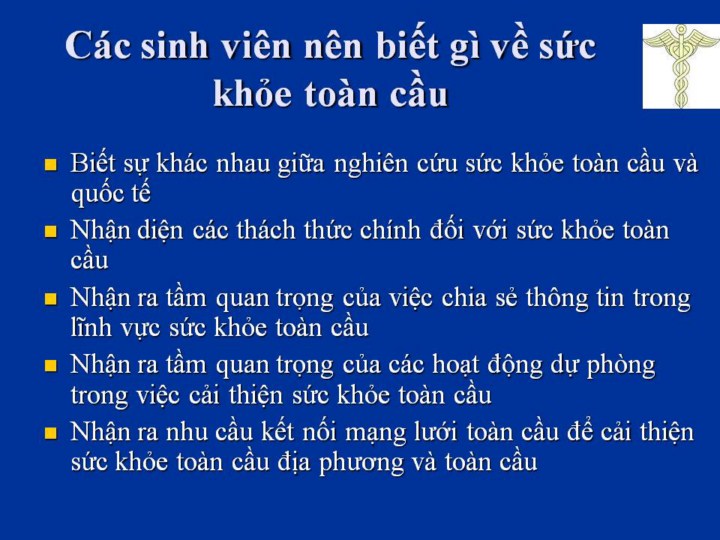 Sức khỏe toàn cầu là một khái niệm quan trọng mà các sinh viên cần phải hiểu. Sức khỏe toàn cầu không phải là về một vấn đề sức khỏe đơn độc như là sốt rét, lao, hay AIDS, bất kể vấn đề nghiêm trọng như thế nào. Sức khỏe toàn cầu không phải là về sức khỏe của một quốc gia hay vùng. Sức khỏe toàn cầu vượt qua các ranh giới và vùng, bao gồm tất cả các nhân tố tạo nên sức khỏe của chúng ta.