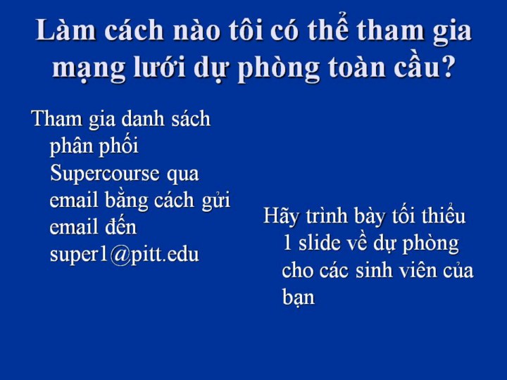 Tham gia danh sách phân phối Supercourse qua email bằng cách gửi email đến super1@pitt.edu Hãy trình bày tối thiểu 1 slide về dự phòng cho các sinh viên của bạn |