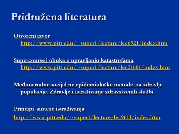Međunarodne socijal ne epidemiološke metode za zdravlje populacije. Zdravlje i istraživanje zdravstvenih službi http://www.pitt.edu/~super1/lecture/lec17561/index.htm
