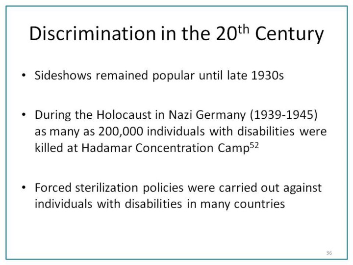 However, these have only been recent changes. Up until the 1930s, abnormal individuals appeared in sideshows throughout the country, which had changed little since the Middle Ages. Crowds still paid a small fee to gawk and gasp at an oddity on stage. During the Holocaust, as many as 200,000 individuals with deformities were killed at the Hadamar Concentration camp. Eugenic and forced sterilization movements also targeted these individuals in countries besides Germany.53 Between 1971 and 1973, the body of Julia Pastrana traveled through the United States. Pastrana had lived during the 19th century and suffered from generalized hypertrichosis terminalis, causing an abnormally large nose and ears and extreme hair growth. Following the publicity for the tour, Pastrana was described as a result of a union between a human and a baboon. 54 Legal and scientific changes have not replaced all theories.