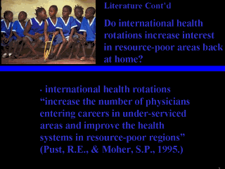 (Chiller, T.M. et al., 1995) - questionnaires to 142 graduates (1993) - 23.1% who attended international rotations intended to work in resource poor areas of the US - compared to 5.6% of those who did not do an international rotation - note: follow-up poor (76 students) ALSO self-selected, no argument for causality) |