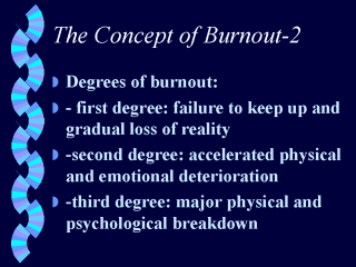burnout involves major physical and/or psychological breakdown (heart attack, ulcer,
