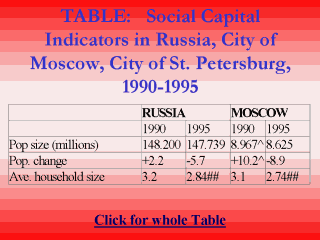 | Although the health status of Moscow is mirrored in the health profile of its sister city, St. Petersburg, Moscow has distinct characteristics: a higher income, lower unemployment, less crime, smaller divorce rate, and the best working conditions in the Russian Federation . |