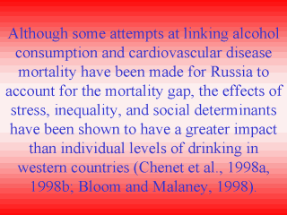 | Given the universality of epidemiological relationships, it is also likely that the same principle holds for Russia and Moscow, if sufficiently accurate data is made available on the social determinants of health (Balarajan, 1989; Carstairs and Morris, 1989; Forsdahl, 1977; Hart, 1990; Marmot and McDowall, 1986; Marmot et al., 1984; Marmot et al., 1991; Rose, 1985; Rose, 1990a). |