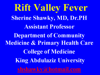 | Further information can be obtained from: - Sherine Shawky. Rift Valley Fever. Saudi Medical Journal 2000; 21 (12): 1109-1115. -www.smj.org.sa/ContentListasp?ContentRef=14#155 |
