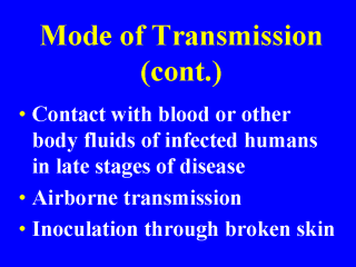 Inoculation through broken skin or wound could be another means of transmission. |