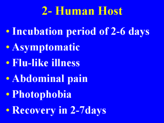| Some people show no symptoms. Others show an influenza-like illness with sudden onset of fever of more than 38.0oC for more than 48 hours, headache, weakness, nausea, myalgia, backache, as well as, abdominal pain and photophobia. The symptoms last for 2 to 7 days after which the immune response to infection becomes detectable with the appearance of IgM and IgG and the patient recovers. While most human cases are relatively mild, a small proportion of patients develops a much more severe disease. |