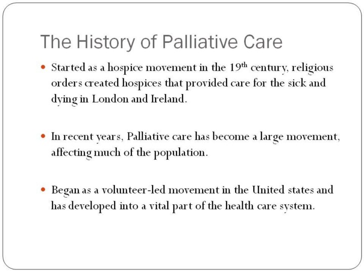 | The first US hospital-based palliative care programs began in the late 1980s at a few establishments including the Cleveland Clinic and Medical College of Wisconsin. Since then there has been a dramatic increase in hospital-based palliative care programs, now numbering more than 1400.