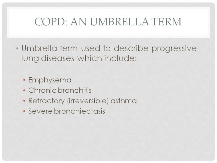 Chronic Obstructive Pulmonary Disease refers to a problem with breathing air out from your lungs. Until recently, most people who had COPD were grouped together and considered to have one disease. We now know that several different diseases cause this difficulty in releasing air from the lungs. Asthmatic bronchitis, chronic bronchitis, and emphysema are three of the major diseases that are grouped together as COPD. Thus, COPD is not just one specific disease but a group of diseases which all cause difficulty breathing.