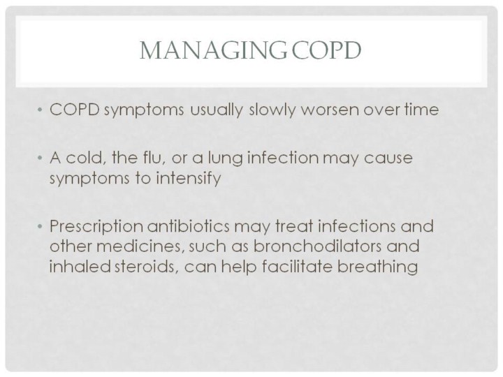 Some severe symptoms may require treatment in a hospital. For more information, go to "What Are the Signs and Symptoms of COPD?"